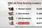 杜兰特在NBA职业生涯总得分榜上排名第八(30571),若按照上赛季场均得分(26.6分),只需要65场比赛,他将超越迈克尔-乔丹(32292)。