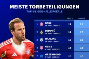 体育资讯10月20日讯 《转会市场》统计了本赛季五大联赛球员在俱乐部各项赛事的直接参与进球总数情况,凯恩、姆巴佩、哈兰德分列前三。