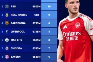 体育资讯10月23日讯 德国转会市场更新了五大联赛球员的最新身价,全球身价前100名的球员中,阿森纳和巴黎圣日耳曼均有10人,两队可以说囤积了非常多的天才球员。