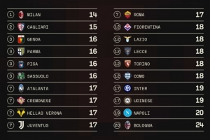 米兰本赛季意甲目前仅使用14名首发球员,全意甲最少