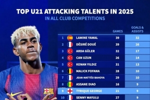 2025年五大联赛U21参与进球榜:亚马尔32球居首,杜埃26球次席